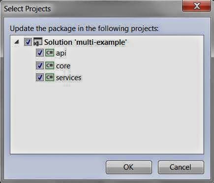 下面是NuGet此解决方案的安装包的“包管理器”屏幕和包的屏幕截图.可以为解决方案中的所有或部分项目更新的配置对话。