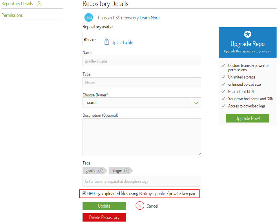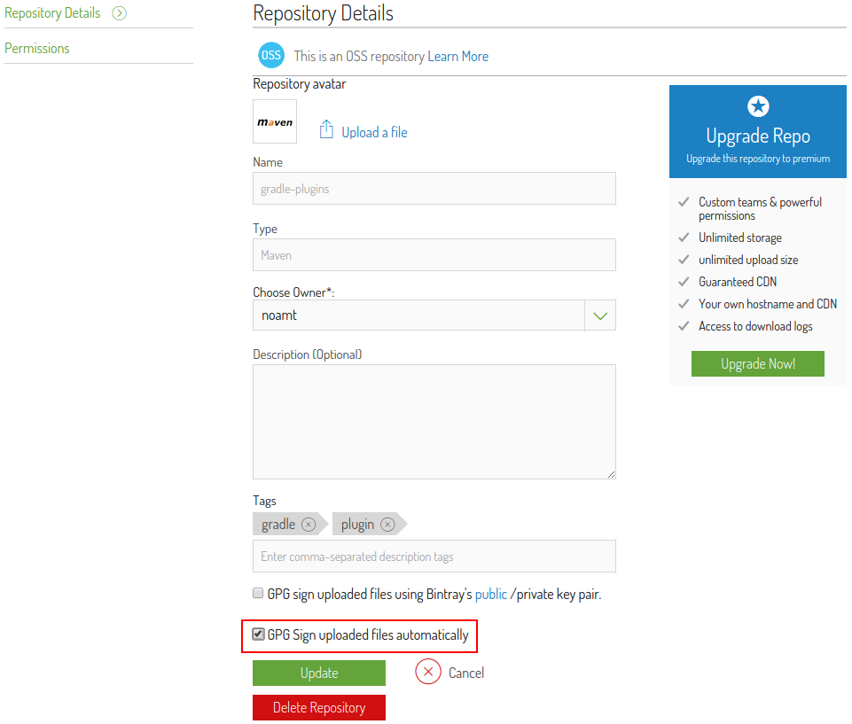 要应用,请编辑存储库的设置并选择使用Bintray的公钥/私钥对GPG签名上传的文件:
