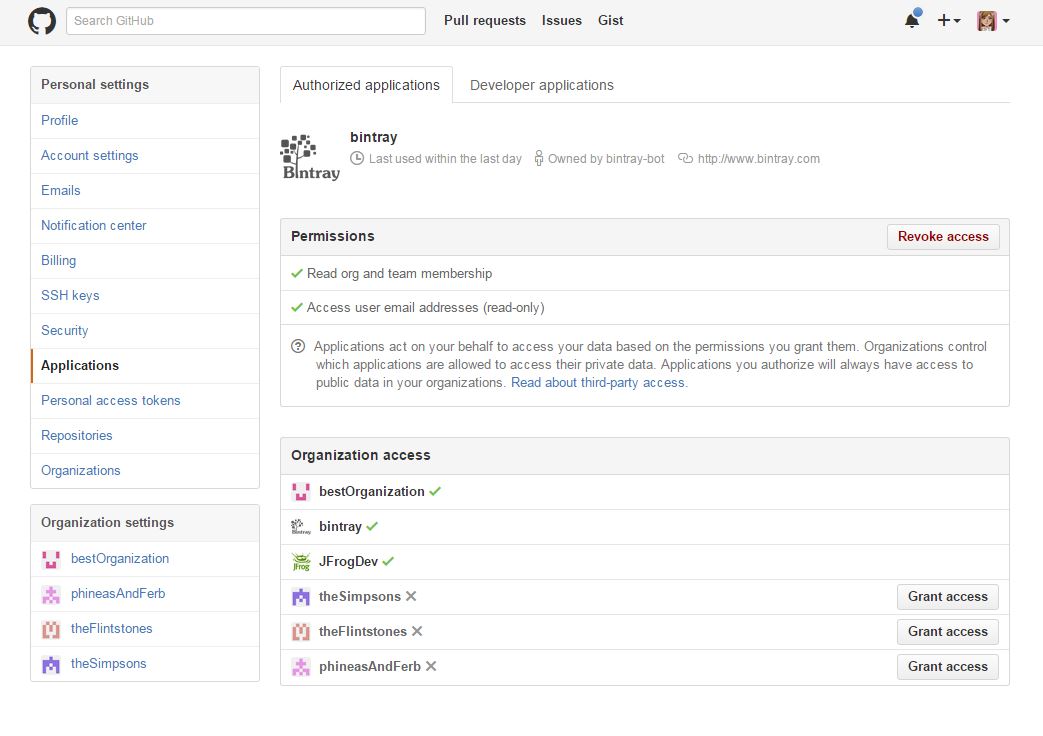 GitHub组织应该通过Bintray授权,以便Bintray能够访问您的GitHub组织。通过进入你的GitHub配置文件授予Bintray访问权限。在“应用程序”部分,你会看到GitHub组织。选择您希望Bintray能够访问的组织。