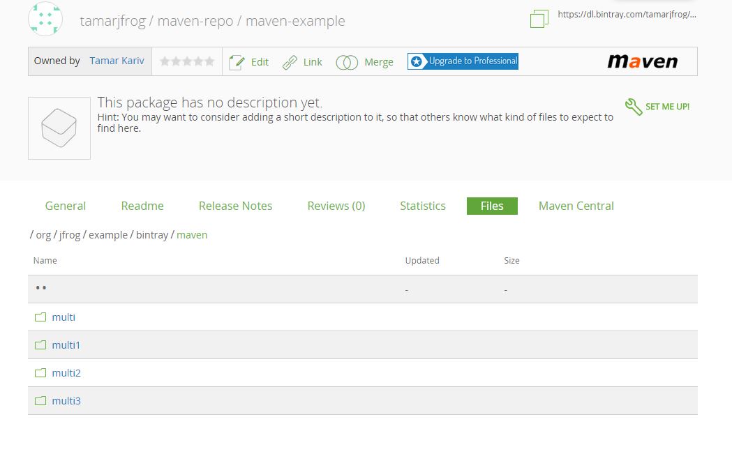 . bintray-repo-maven-example https://api.bintray.com/maven/tamarjfrog / maven-repo / maven-example /;publish=1