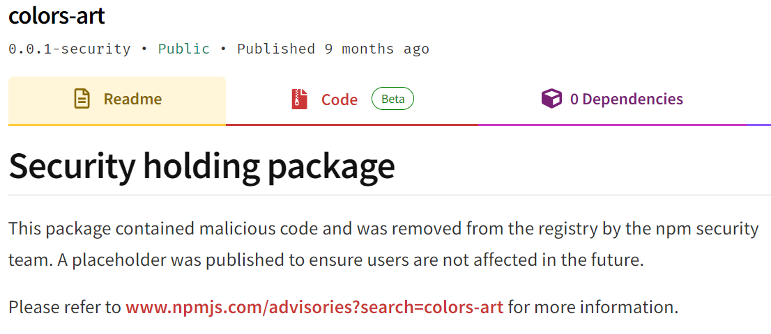 The tracking in npm is slightly better. Reported malicious packages are replaced with dummy code and they’re tagged as a安全holding package,as you can see in this screenshot below of a malicious package calledcolors-artin npm:
