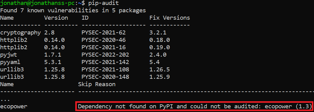 The second problem is that even if we would like to use the repositories’ data to scan for malicious packages, common security auditing tools report vulnerabilities but not malicious packages. For instance, take a look at the following result of executing the PyPI toolpip-auditafter the malicious packageecopowerwas installed. The package couldn’t be scanned (as seen below) because it was removed from PyPI repository after it was reported as malicious: